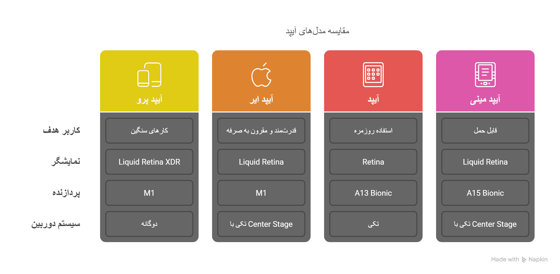 اپل آیپد را در مدلهای متنوعی تولید میکند؛ از جمله iPad، iPad Air، iPad mini و iPad Pro که هرکدام در اندازه، توان پردازشی، ظرفیت حافظه و امکانات جانبی، تفاوتهایی دارند. این تنوع باعث شده تا کاربران بسته به نیاز و بودجه، گزینهای مناسب برای خود پیدا کنند.